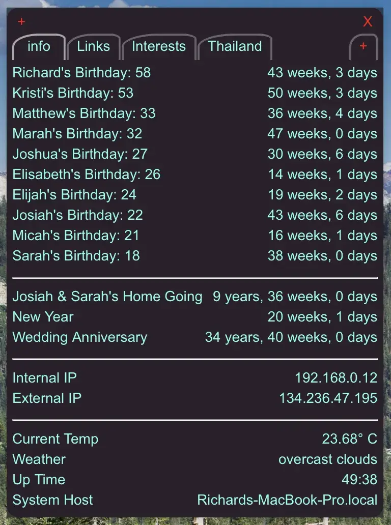 ScriptBar 是一个用于显示脚本或 Node-Red 服务器输出的程序。 它运行 EmailIt 程序中定义的脚本,并显示输出结果。 可以使用来自 xBar 或 TextBar 的脚本,但目前只有 TextBar 的脚本运行良好。 它还可以显示你系统中的脚本输出。 ScriptBar 并没有把它们放在菜单栏中,而是提供一个方便的窗口,方便用户查看。 你可以使用多个标签页来显示不同的内容。 还可以保留访问次数最多的网站链接。